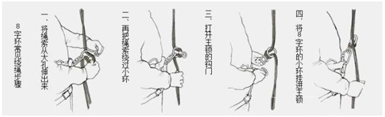 第二步:系好安全带和8字环、挂扣相链接。将绳索从大孔伸出来,再把绳索绕过小环,打开主锁的钩门,将8字环的小环挂进主锁(如下图)。