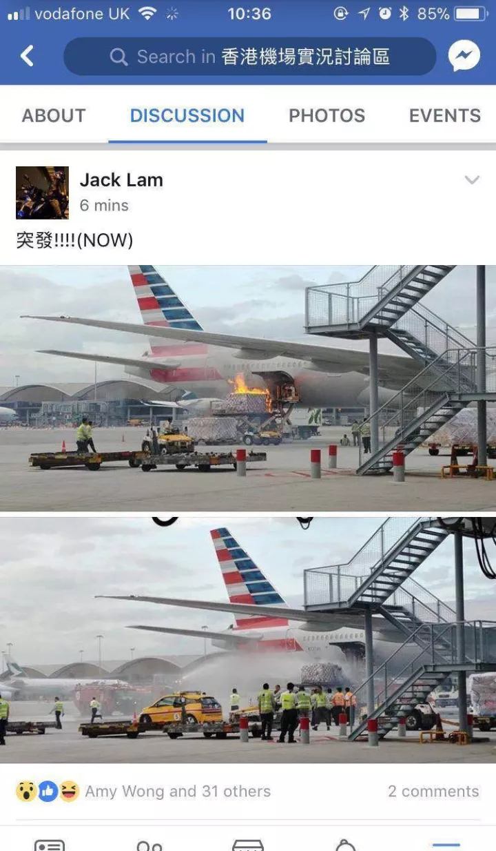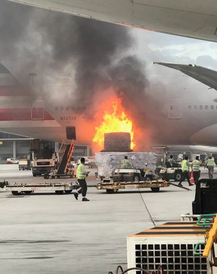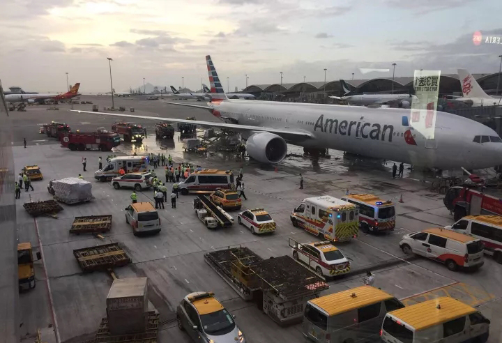 美国航空一班编号AA192客机原定于傍晚6时10分出发前往美国洛杉矶,至下午5时许于42号停机坪停泊时,近机尾的上货位置有货物怀疑起火,火速迅速蔓延,客机亦被波及。火警期间,有职员逃生时不慎坠地受伤。消防接报赶至,迅速将火熄灭,目前起火原因正在调查中。