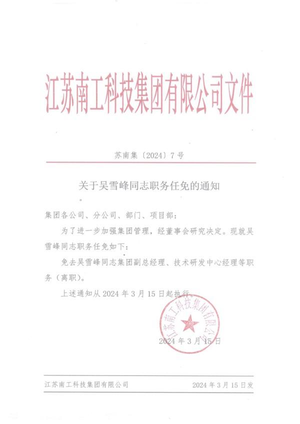 关于吴雪峰同志职务任免的通知