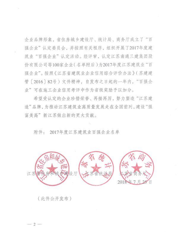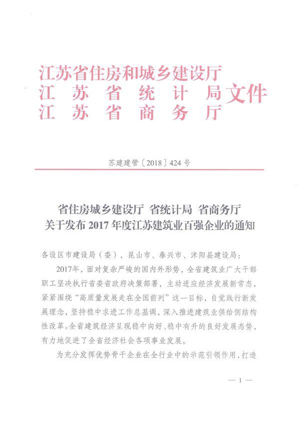 近日,江苏省住房城乡建设厅、江苏省统计局、江苏省商务厅联合发布2017年度全省建筑业“百强企业”名单,江苏k1体育科技集团有限公司以出色的成绩荣登百强企业榜单。