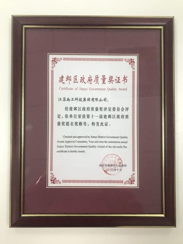 江苏k1体育科技集团有限公司荣获“第十一届建邺区政府质量奖提名奖”称号。